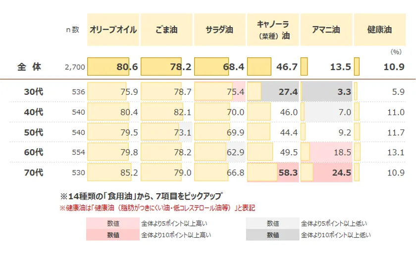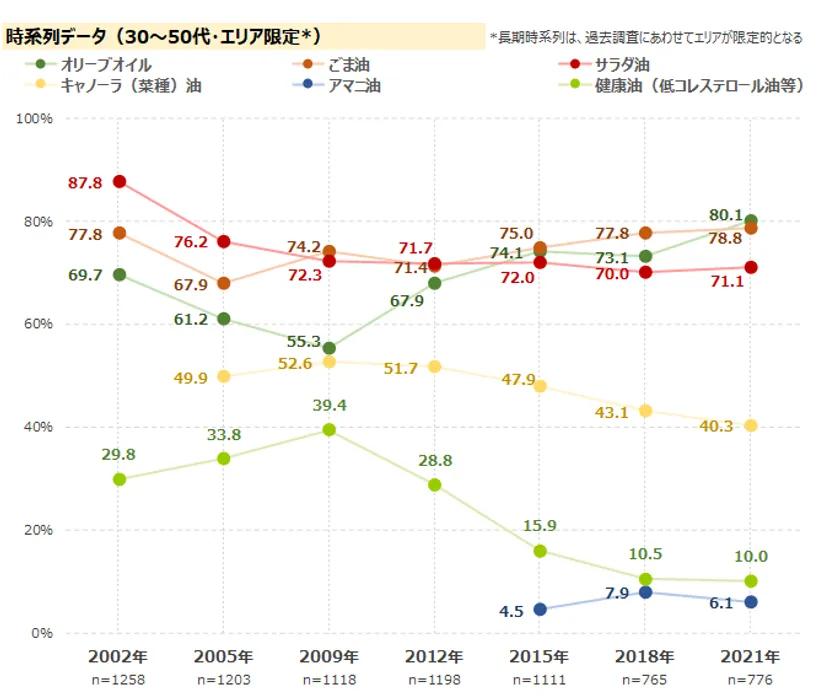 普段自宅で料理に使用している食用油を確認したところ、「オリーブオイル」が最も高く8割。全年代で8割前後と高い使用率で2009年以降増加傾向が続いており、今回1位にランクイン。年代別でみると、「キャノーラ(菜種)油」は70代が6割弱と高い一方で、30代は3割を下回る。「アマニ油」は70代が2割強と、70代は様々な油を使用していることがうかがえる。時系列でみると、「キャノーラ(菜種)油」と「健康油」は2009年以降減少傾向が続いている。