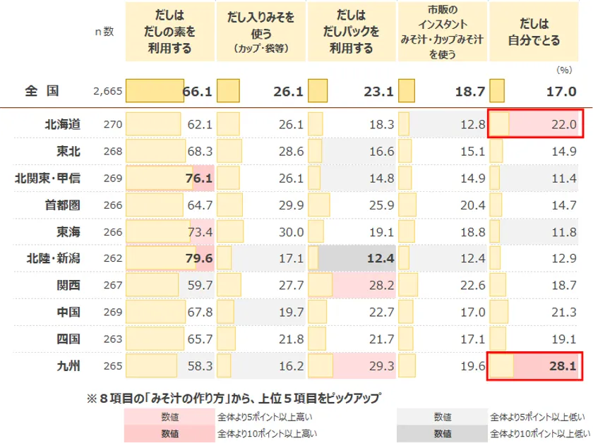 調査結果4:みそ汁のだしは「だしの素を利用」が高い一方、北海道・九州は「自分でとる」も2割