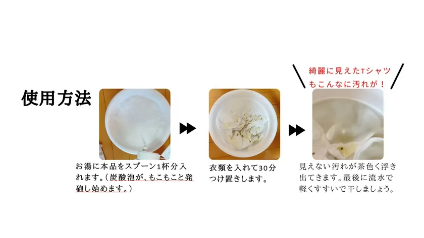 本品では、従来の酸素系漂白剤に配合される炭素数を5倍増量した強い泡立ちが特徴です。洗濯機洗浄では落とせなかった、見えない汚れを絞り出すことが可能になりました。