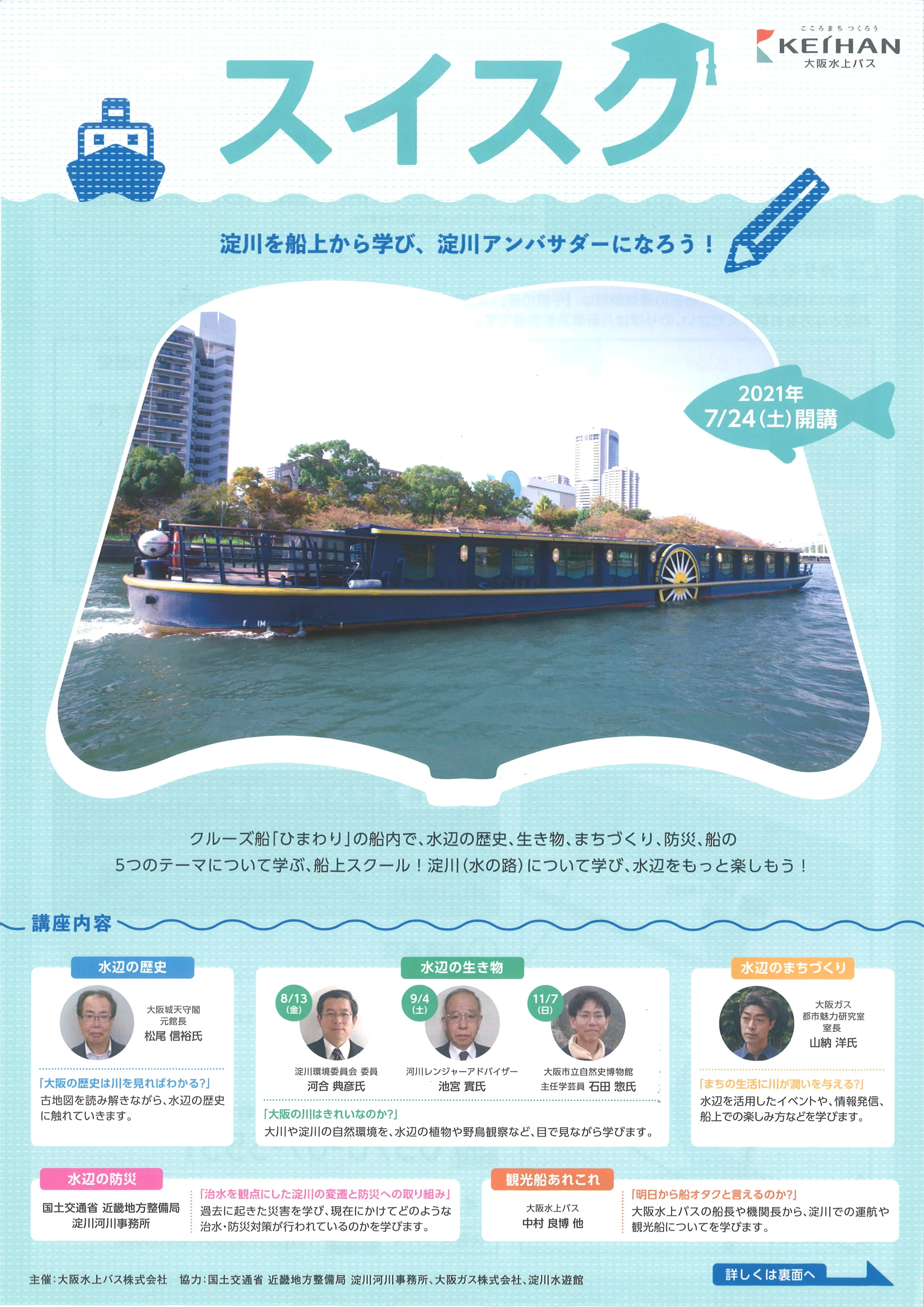 学習船『スイスク』は、淀川について学び、水辺をもっと楽しもうという趣旨で企画したクルーズです。
