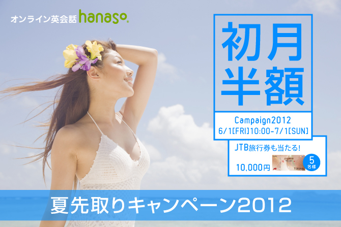 2012年6月1日 10:00株式会社アンフープ(所在地:静岡県富士市、代表取締役社長:重森 渉)がサイト運営する、無料通話ソフトSkype(スカイプ)を利用したオンライン英会話スクール「hanaso」では、2012年6月1日(金)10:00~7月1日(日)に新規会員登録の方全員に初月の月額料金(3,800円~9,800円)が半額になる『夏先取りキャンペーン2012』を実施いたします。