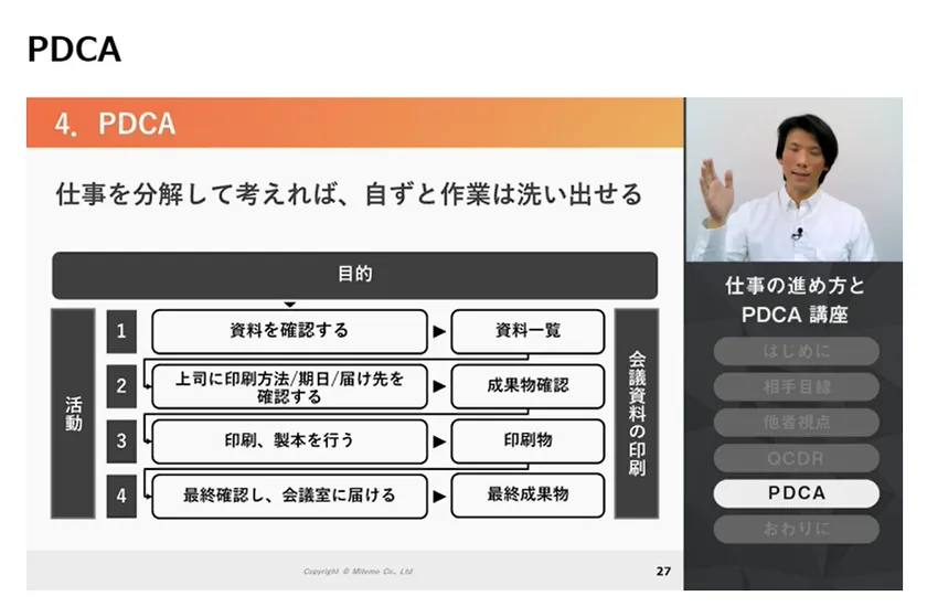 【概要】講師が様々な業界・業種に共通する仕事の進め方のポイントを解説します。大きく4つの考え方「相手目線」「他者視点」「QCDR」「PDCA」について、それぞれの活用方法をケース毎に学んでいきます。