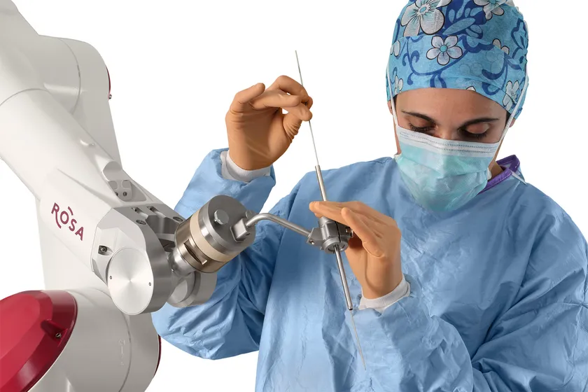 ROSA One ロボットシステムは、脳神経外科及び脊椎脊髄外科領域の手術を支援する医療機器です。患者及び手術器具の位置情報などをリアルタイムで画像表示しながら、術前に定められた手術計画に従いロボットアームが手術器具を運搬・把持することで術者を支援します。
