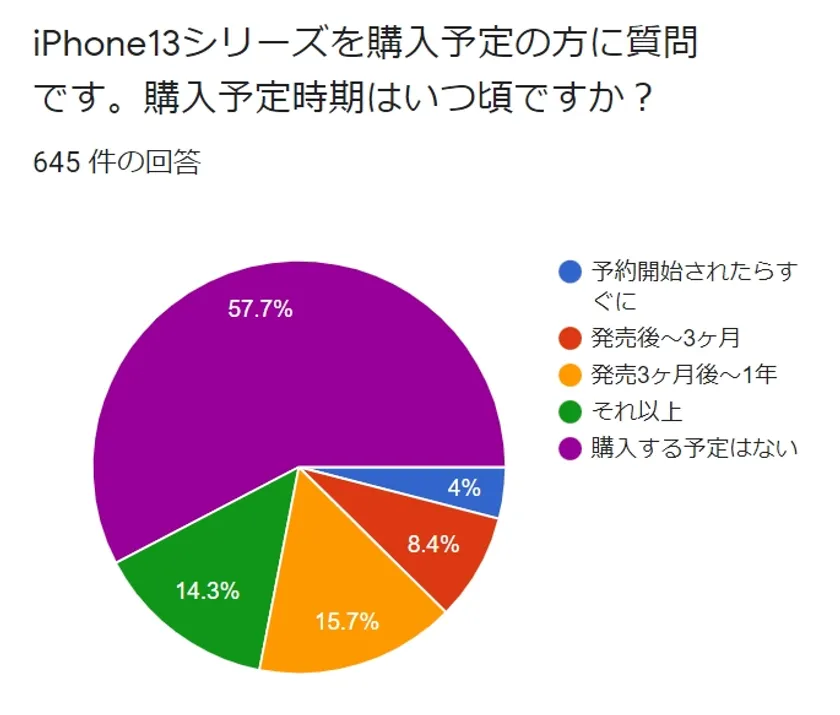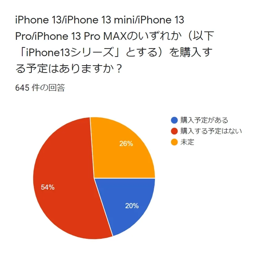 iPhone 13シリーズを購入する予定があると答えたのは20%。未定と回答のは26%。購入する予定がないと答えたのは54%でした。4割以上の回答者がiPhone 13購入の可能性がある結果となりました。