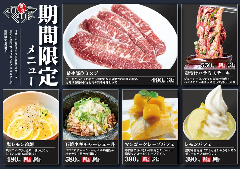 肉問屋直営の目利きを活かした『希少部位ミスジ』や『壺漬けハラミステーキ』、専門店に負けない本格サイドメニューなど、6アイテムを期間限定でお召し上がりいただけます。なお、今回の期間限定メニューは、希少部位ミスジを除く5アイテムを「食べ放題ぐりぐりプレミアムコース(税込3,000円)」、全6アイテムを「食べ放題厳選牛極みコース(税込3,600円)」のお客様もご注文いただけます。