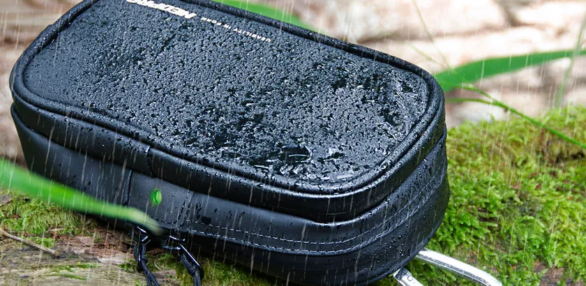 ポーチ本体はまるでゴムのような感触で傷が付きにくく、水濡れにも強い加水分解しにくいポリウレタン素材。ファスナーにも水滴の侵入を軽減する止水ファスナーを採用し、少々の雨や雪でも使用可能です。