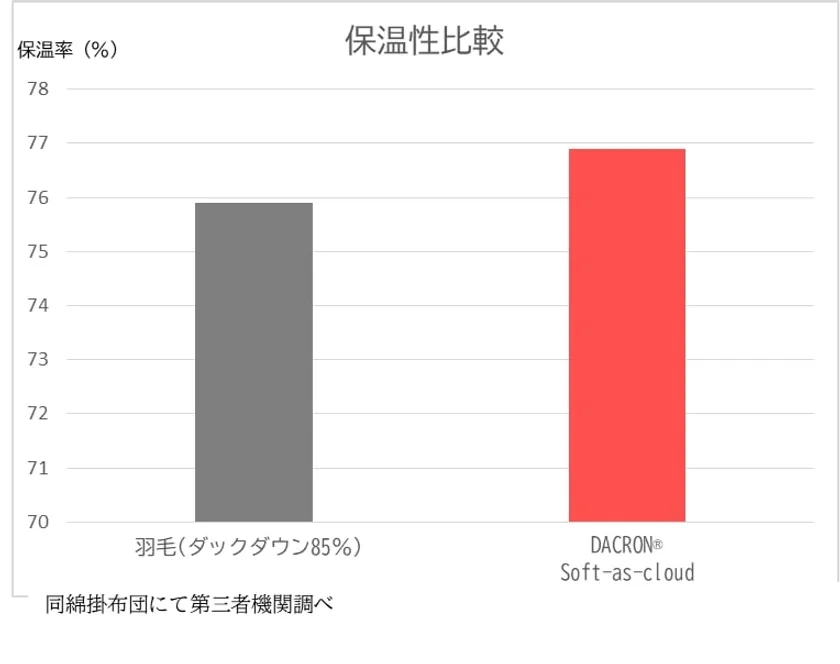 この特殊綿はふんわり感が羽毛に似ているだけでなく、保温性は羽毛以上という試験結果が出ています。