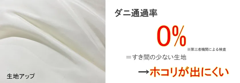 3. ダニ通過率0%の高密度生地を使用。生地のすき間からホコリが出にくいのでお掃除の手間も減ります。