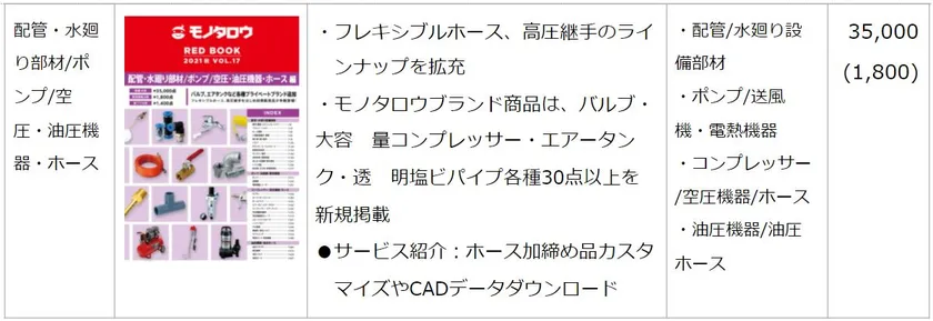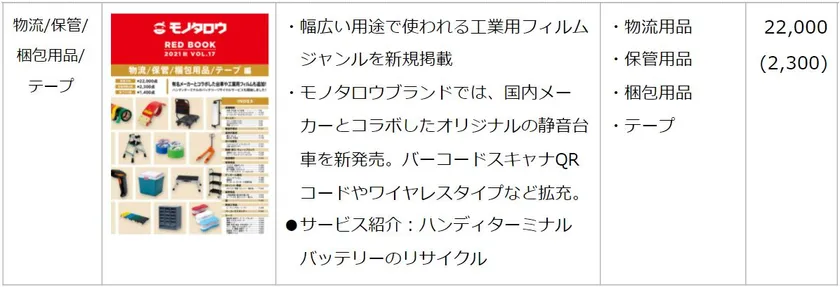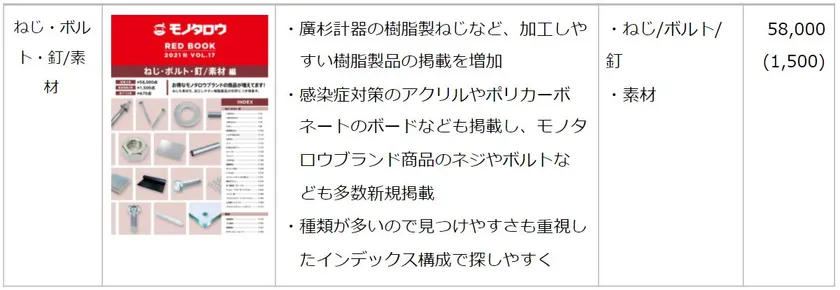 工業用間接資材(※1)通信販売最大手 株式会社 MonotaRO(モノタロウ)は、2021年9月26日(日)、登録ユーザー様向け商品カタログ【間接資材総合カタログ RED BOOK 2021秋 VOL.17】を発刊しました。