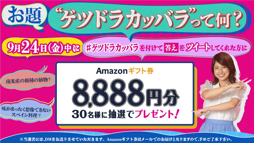 カンテレでは、#ゲツドラカッバラをつけて予想をツイートすると、抽選で30名にAmazonギフト券(8,888円分)が当たるクイズキャンペーンを9月24日(金)に一日限定で実施いたします。