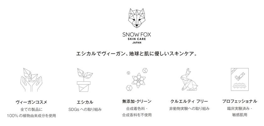 Snow Fox Skincareは地球第一主義を掲げ、ヴィーガン・エシカル・クルエルティフリー・クリーン・プロフェッショナルの5つの哲学を商品開発理念に掲げています。肌荒れ、敏感肌、年齢肌に悩む方々が、根本的な肌環境改善にアプローチできるプロフェッショナルなスキンケアとして2016年末にアメリカで発売されました。2021年5月にECサイトで日本公式販売が開始されてから、様々な雑誌やメディアで少しずつ取り上げ初めていただいており嬉しく思います。美容家のみなさまや愛用していただいた方からもコンセプトと商品の実力を高く評価していただけていることが、日本上陸後の私たちの自信となりました。肌の悩みを解決できる実力派ブランドとして、エシカル・ヴィーガン・クルエルティフリー・プロフェッショナル(皮膚科医共同開発)・クリーン(無添加・無着色・無香料)を基本理念に1人でも多くの方に私たちの製品を愛用していただけるよう、商品開発に今後も取り組んでいきます。