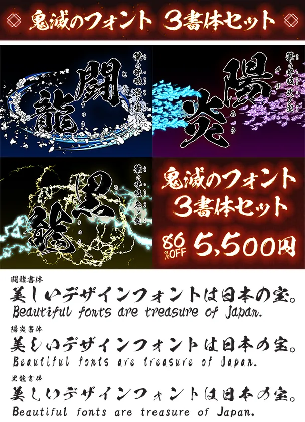 人気アニメ「鬼滅の刃」で使用された昭和書体の人気デザイン毛筆書体 闘龍書体・陽炎書体・黒龍書体の3書体をおまとめしたお得なセット商品。通常価格の86%OFFとなる2021年10月31日までの期間限定商品です。