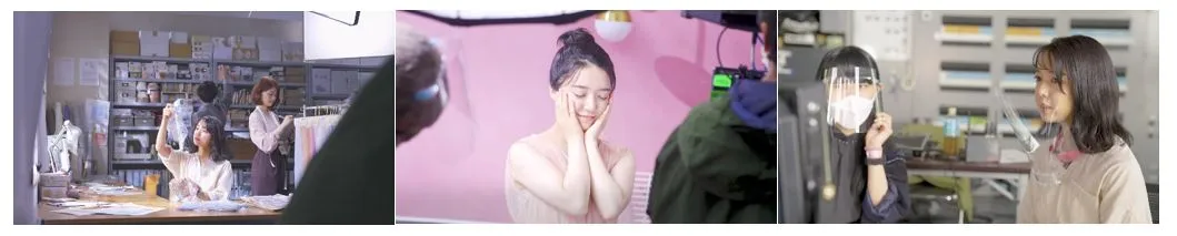 真剣な表情で製品サンプルの生地を見る上白石さん。ビジューのついた生地と、肌にも仕事にも自信が出てきた表情の上白石さんにやさしい光が注ぎ込み、どちらもキラキラ輝いています。職場での上白石さんのアップシーンでは入社6年目を迎え、仕事にも慣れて自信の出てきた顔つきと美しい肌に注目です。スキンケアシーンでは、少しリラックスした可愛らしい上白石さんと、思わず触れたくなるような「やわ肌」をご覧いただけます。
