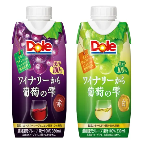 「Dole(R) ワイナリーから 葡萄の雫」シリーズは、甘すぎない味わいで、ご褒美感やリラックス感が味わえる、果汁100%、大人のためのワイン風葡萄果汁です。