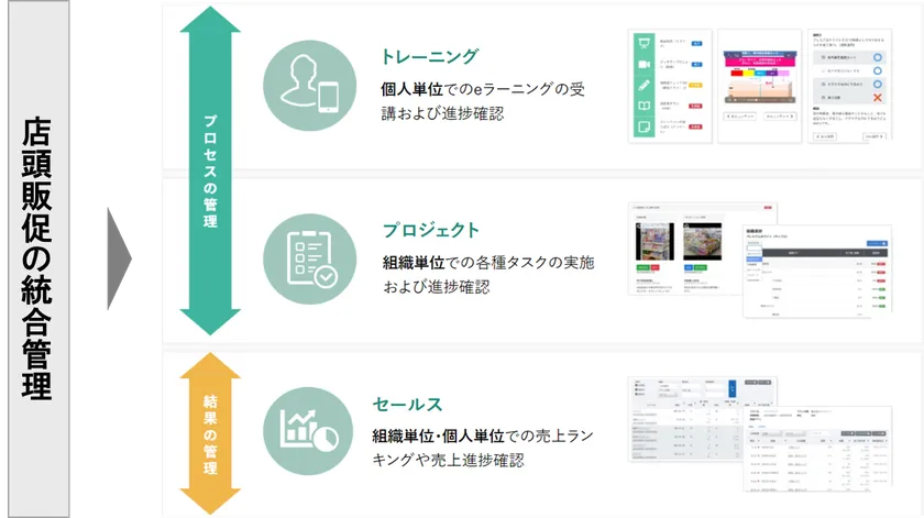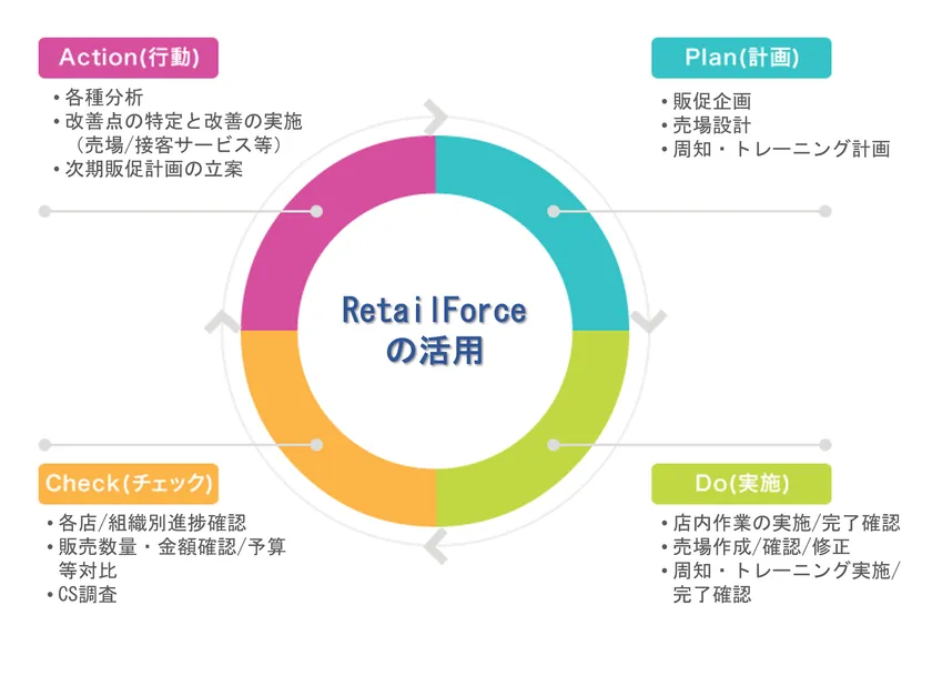 小売業各社はRetailForceの本機能を用いることで、販促業務を効率的に企画実施するだけでなく、それらの結果をタイムリーかつ分かりやすく把握することができ、販促のPDCAを高速に回転させることが可能となります。また、各店の数字やランキングを店舗間でも共有することで、店舗間で切磋琢磨しながら販促を実施し、売上計画の達成、重点品の販売促進等に繋げることができます。