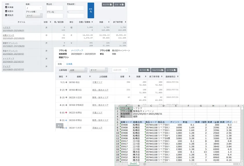 社内の販売管理システム等と連携し、販売数量、販売金額等のデータを取り込み、RetailForceに登録された販促施策に関する情報や商品情報等と紐づけ、組織別、店舗別、個人別等で実績(進捗)、計画対比、進捗率等を分かりやすく表示します。組織別、店舗別、個人別等でのランキング表示、販売数量等の実績を所定の方式で換算した「ポイント」表示等が可能です。各種検索やデータ出力機能を備えており、詳細な分析ニーズに対応します。