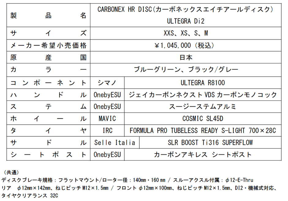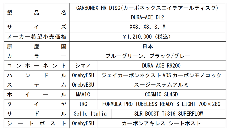 このCARBONEX HR DISCにシマノDURA ACE R9200シリーズ、シマノ ULTEGRA R8100シリーズを組み込み、「CARBONEX HR DISC DA」、「CARBONEX HR DISC UL」として弊社では初となる完成車を数量限定にて販売いたします。