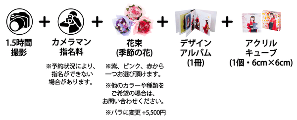本プランでは、プロポーズという特別な瞬間を彩るため、経験豊富なカメラマンによる1時間半にわたる撮影で約200枚の写真を提供します。さらに、花束のご用意やカメラマンの指名が可能で、お客様一人ひとりに合わせた特別な演出をサポートいたします。撮影した写真は、2面アルバムに美しくまとめられ、さらに思い出を一層引き立てるアクリルキューブもプレゼントとしてご用意しています。