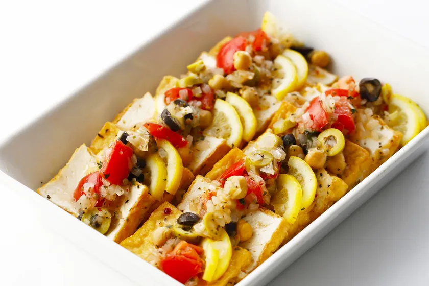 焼いた厚揚げに、ひよこ豆、玉ねぎ、トマトが入った具材感のあるソースを添えました。ハーブが香ります。