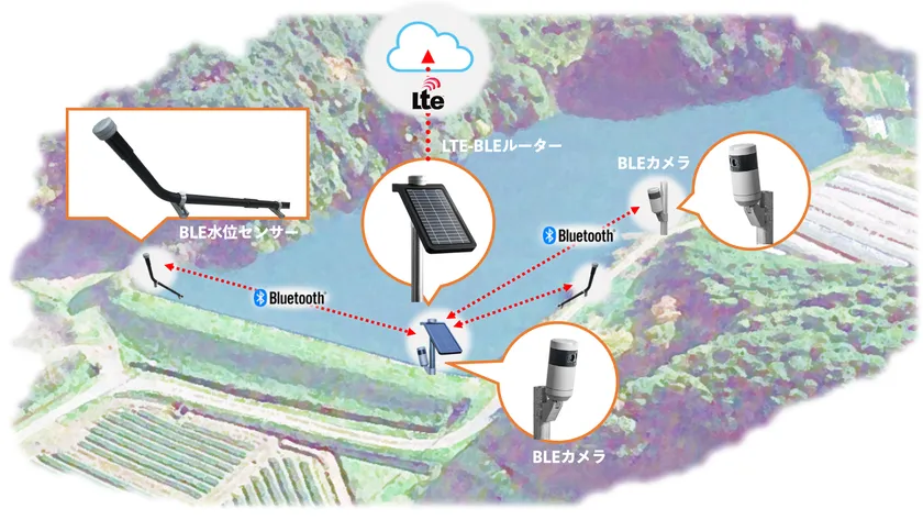 「ソーラーパネル一体型ルーター」と「水位センサー」、オプションの「カメラ」で、低消費電力の無線ネットワークを構成。これらの機器はすべて外部電源や配線工事が不要な独立電源駆動となっており、それぞれの機器を独立して設置できるため、現場での設置の自由度が高く最適な場所に設置が可能です。