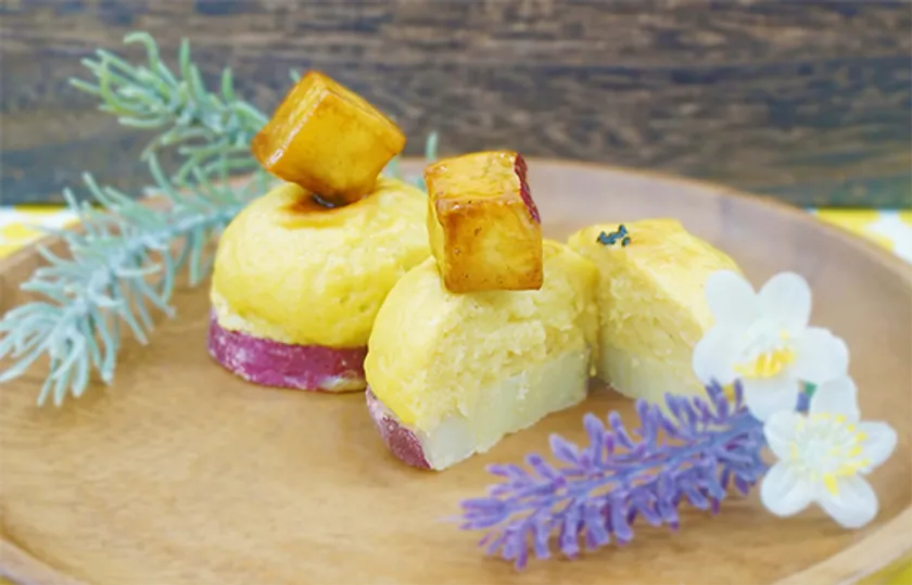 さつまいもの壁で仕上げたスイートポテトとチーズケーキの2層ケーキ。お芋の自然な甘さとチーズの酸味が相性抜群。
