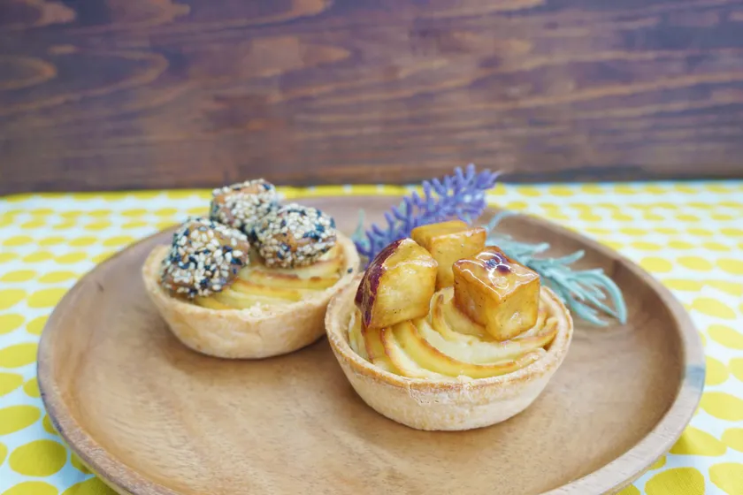 サクサクパイ生地のタルトにお芋クリーム。ぐるぐるクリームに大学芋をトッピング。