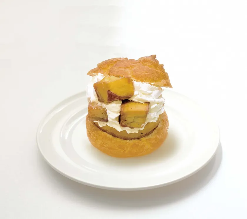 お芋のクリームと生クリームがたっぷり入ったシュークリームに大学芋をトッピング。