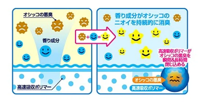 (1) 「高速吸収ポリマー」と「ふんわりアロマ成分」のダブル消臭で瞬間&長時間消臭を実現しました。