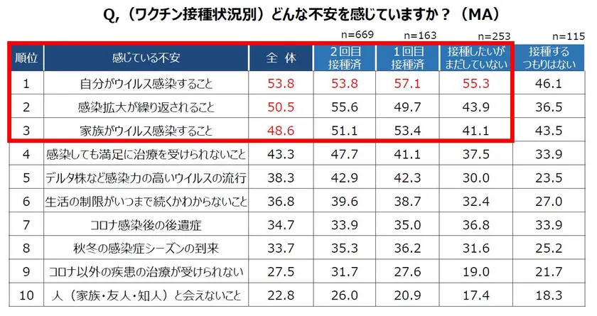 ●5. ワクチン接種の有無に関わらず、半数以上が感染への不安を抱える。コロナ禍における不安は、「自分がウイルス感染すること」(53.8%)「感染拡大が繰り返されること」(50.5%)。