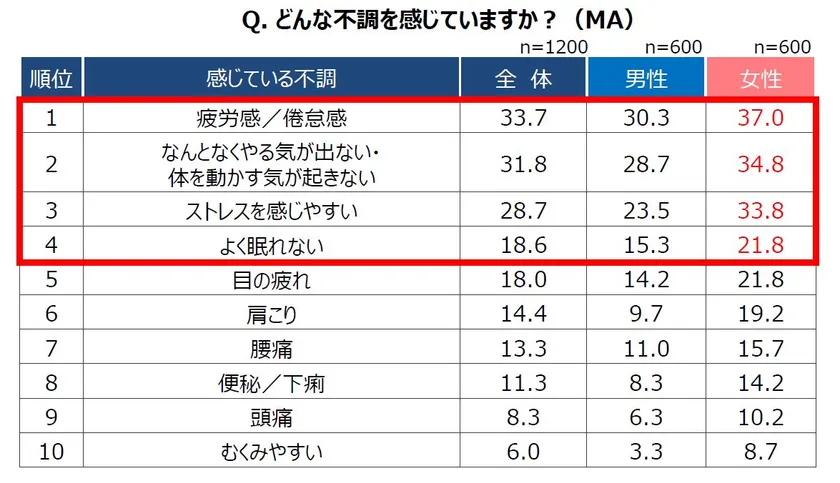 ●2. 不安疲労に関連する不調「疲労感/倦怠感」、「意欲低下」、「ストレス」、「睡眠不調」が上位を占める。女性が心身の不調をより多く抱える傾向