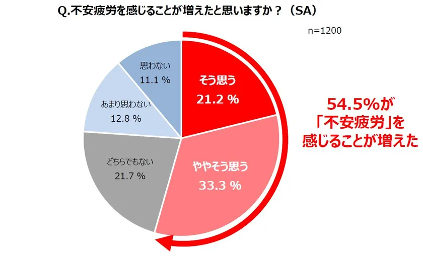 当研究会では、“生活の変化によりストレス・不安を感じることが多くなり、疲労感を感じている状態”を「不安疲労」と呼んでいます。「不安疲労」は長引くコロナ禍によって顕在化している精神的疲労と身体的疲労が結びついた心身の不調と言えます。回答者に「不安疲労」を説明したうえで「不安疲労」を感じているか伺ったところ、全体の54.5%が「不安疲労を感じることが増えた」(前回より1.8pt増)と回答しました。