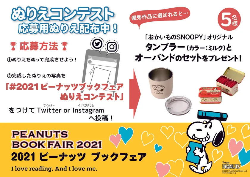 「PEANUTS BOOK FAIR 2021」オリジナルの絵柄を使ったぬりえを完成させ、「#2021ピーナッツブックフェアぬりえコンテスト」をつけてTwitterまたはInstagramに投稿すると、優秀作品に選ばれた5名様に「PEANUTS」公式オンラインショップ「おかいものSNOOPY」( https://okaimono-snoopy.jp/ )オリジナルのタンブラーとオーバンドのセットが贈られます!