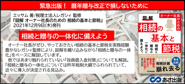 株式会社あさ出版(代表取締役:佐藤和夫、所在地:東京都豊島区)は 監修:税理士法人レガシィ/著:エッサム 『図解 オーナー社長のための相続の基本と節税』を2021年12月9日(木)に刊行いたします。