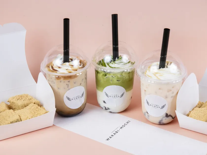 とろとろ食感のわらびもちをストローで飲む新食感のドリンクです。伝統的な和菓子のわらびもちに生クリームとドリンクを合わせ、洋風スイーツにアレンジしました。一番人気フレーバーは黒蜜です。