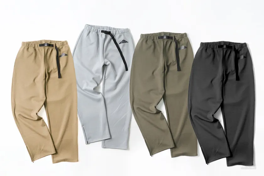 表8G・裏32Gの異なるゲージで編み上げた通称クオーターニットと呼ばれる素材は独特の見た目。軽量で伸縮性があり快適なだけでなく、生地の中に空気の層を含むため保温力に長け、撥水性も高いため雨にぬれたり洗濯しても乾きやすく、着用時は温かい。クルーネックセーターにはサイドポケットを搭載。パンツの膝は立体構造で動きやすく、フロントも着脱がしやすい設計です。