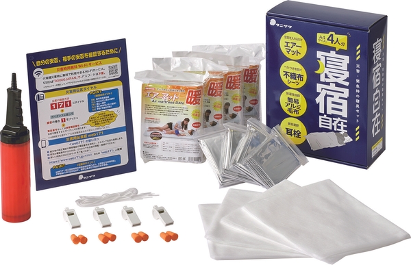 - エアーマット、アルミ毛布、不織布シーツ、耳栓、ホイッスルのセット