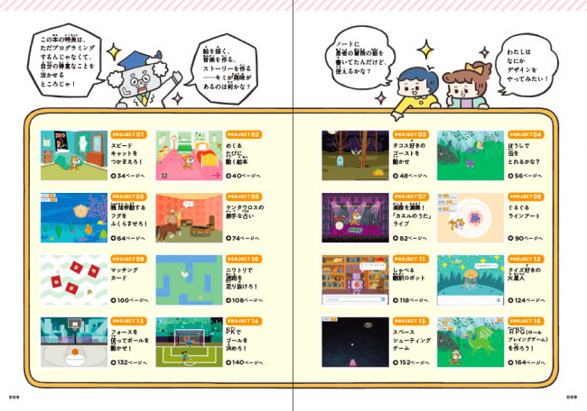 また、本書では、全部で16個の作品に10問ずつのチャレンジ問題もおまけでつけました。「体験」だけで終わらせず、子どもたち の「創作」につなげていくためです。(チャレンジ問題の解答・解説はPDFダウンロード方式)座標や関数といった内容も、小学生でもわかるようにていねいに解説。漢字にはふりがな付きなので、お子さん一人でも読んで取り組めます。