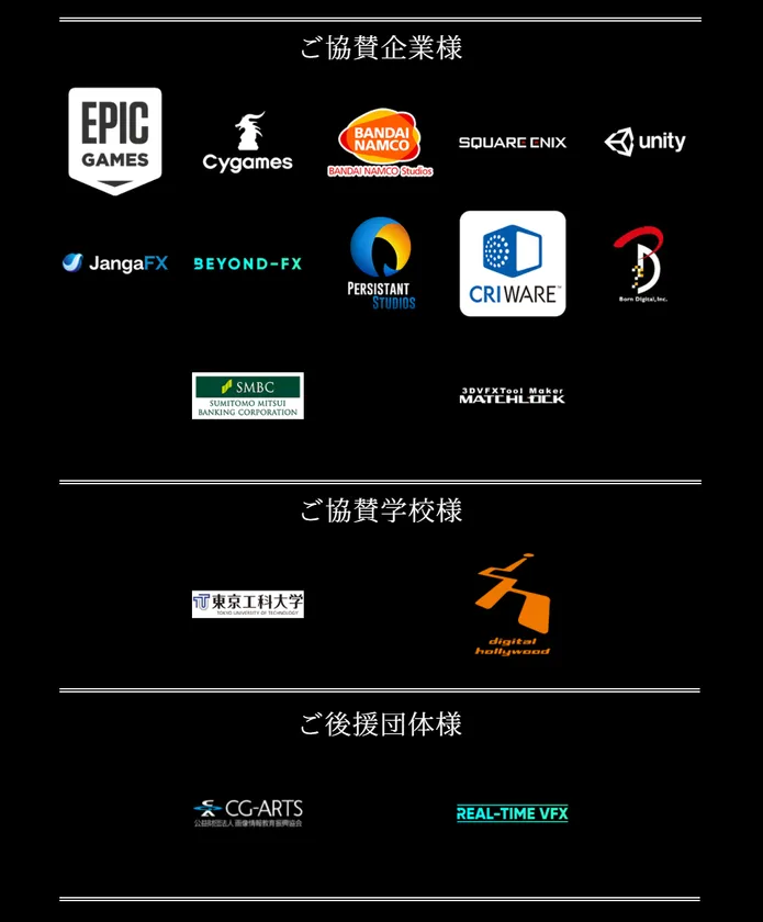 本コンテストには、VFXコミュニティの活性化や、新たなる“VFXアーティストのスター”の発掘などを実現して、VFX業界全体を盛り上げていきたいという思いが込められており、現在ゲーム・3DCGデザイン業界で大きな影響力を持つ各法人様にご賛同・ご協賛をいただいております。