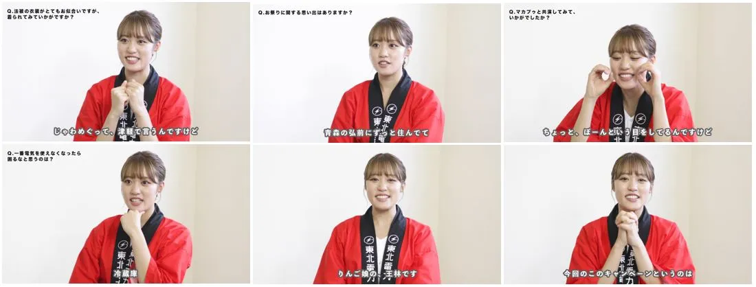 本TVCMには、法被姿でお祭りを盛り上げるりんご娘のリーダー・王林さんが登場。東北電力のマスコットキャラクター・マカプゥとの共演が実現しました。王林さんのナチュラルな津軽弁や笑顔が印象的なCMとなっております。