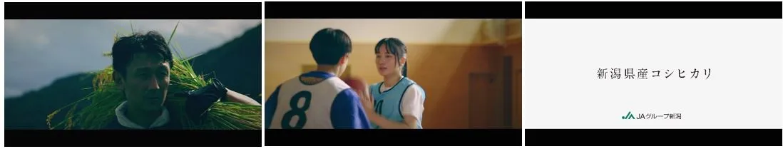 「あきらめない」人の気持ちによって育った新潟県産コシヒカリのおいしさを、新潟県内に住むある家族の物語を通して描いています。登場人物は部活に打ち込む娘、コシヒカリを生産する米農家の父、二人を支え見守る母。娘役を注目の若手女優・平澤瑠菜さんが演じ、父親役を舞台や映画等で活躍する本郷弦さんが演じました。部活や仕事で壁にぶつかる娘と父が、コシヒカリを食べて力強さや自信を取り戻す様子を描く、心温まる動画になっています。