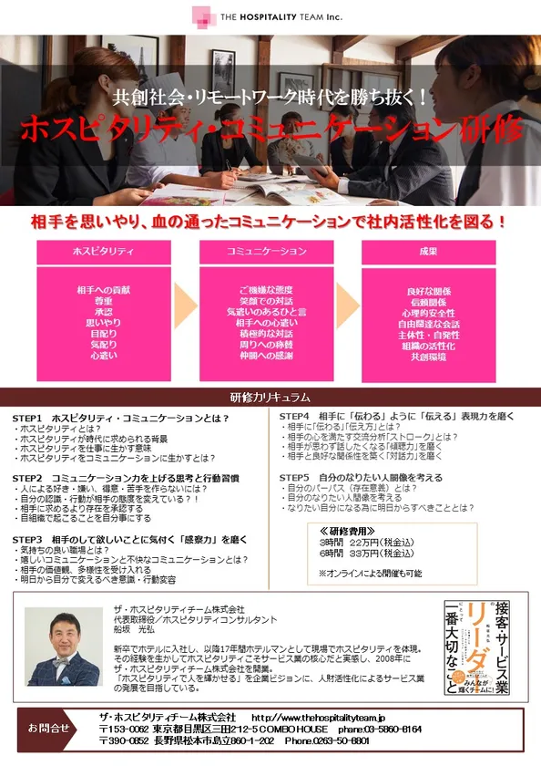 ザ・ホスピタリティチーム株式会社(東京都目黒区)は、企業のコミュニケーションの課題を解決する為の「ホスピタリティ・コミュニケーション研修」を企業向けに受注開始しました。