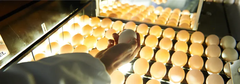 東山産業の卵は、汚れやヒビを人の目とセンサーでダブルチェック。お湯で殺菌洗浄した高品質の卵だけを選び抜き、衛生管理・温度管理の行き届いた場所から採れたての安心・安全な卵を食卓にお届けしています。