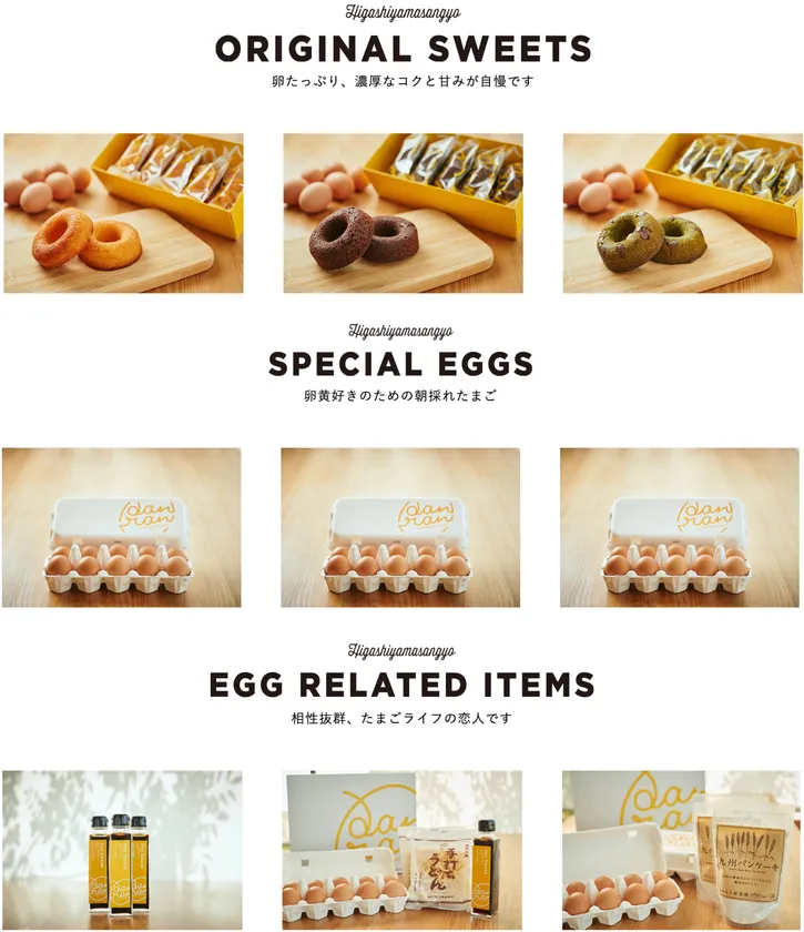 農事組合法人 東山産業(所在地:香川県木田郡三木町、代表理事 志渡聡一郎)は、卵黄好きのための濃厚でコクの深い卵を開発し、このたびオンライン限定で定期販売を開始します。あわせて、生産した鶏卵を使用した6次産業化商品を販売する同社運営の直営店「たまごの専門店danran(だんらん)」にて自社製造していた各種スイーツや商品もオンライン販売を開始。WEBサイトのプロデュースおよび制作ディレクションを株式会社しわく堂(所在地:香川県三豊市、代表取締役:関 大樹)が手がけました。