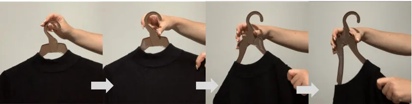 ハンガーを折り畳んだ状態で、衣類の首元からハンガー入れて、両手でカチッと音がするまで広げます。下からハンガー入れる手間が省けます。
