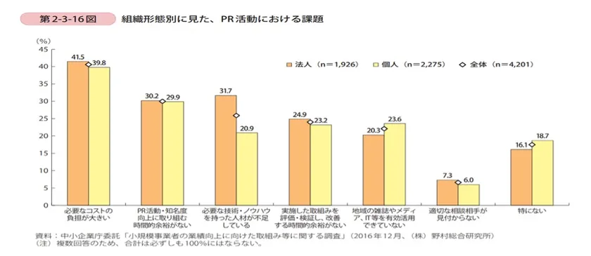 2016年「小規模事業者の業績向上に向けた取り組み等に関する調査」(上図)において、当事業者のPR 活動や知名度向上への取り組みでは、コストの負担や時間的余裕のなさが課題となっています(株式会社野村総合研究所調べ)。法人事業者では、必要な技術・ノウハウを持った人材の不足も大きな課題の一つです。