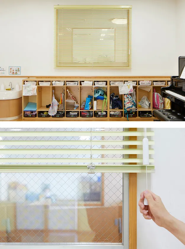 操作するコードがループ状になっていないため絡まる心配がなく、小さなお子さまがいる場所でも安心・安全に使用できるよこ型ブラインド。昇降はコード止めを上げ下げして行う簡単操作。コードは自動で引き戻されるため垂れ下がらず、すっきりと納まる。操作部は抗菌、または抗ウイルス加工のため、保育施設や公共施設での使用も安心。