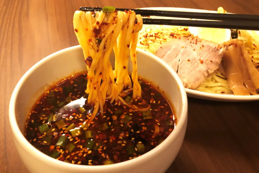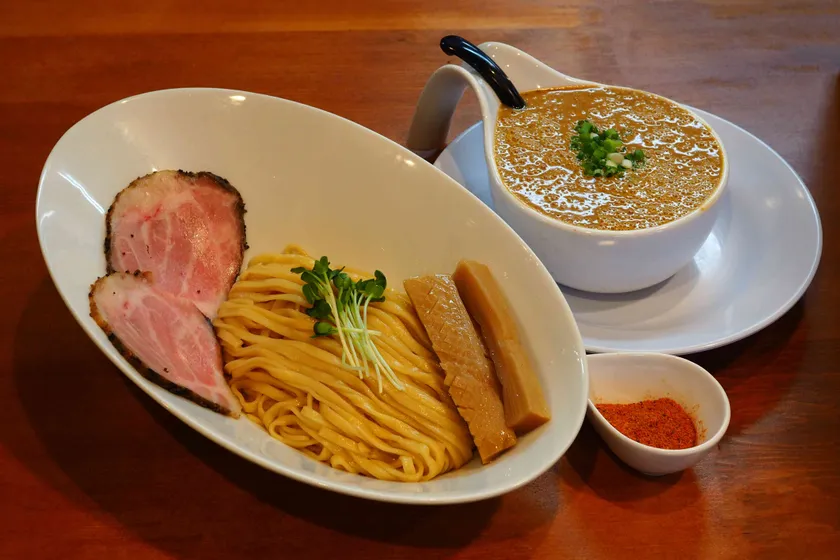 濃厚魚介スープにスパイスを混ぜ、自家製ラー油を配合。麺は歯ごたえある太麺で、スパイスを練り込み、茹でている最中から香りが広がります。後入れのチリパウダーで辛さの調整も可能です。濃厚なスープとスパイス麺がマッチする他にはない味わいです。