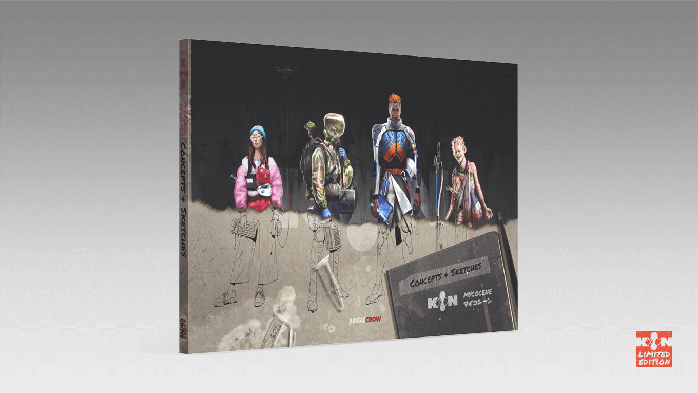 『KIN―マイコシーン』は、ジャングルクロウ・スタジオが初めて世に送り出すオリジナルSFアートブックです。環境破壊やテクノロジー依存など、まさに現代に対する危機意識をもとに、「物語」がもつ社会や未来への影響力を信じて、クリエイターたちの強いメッセージがこめられた作品です。