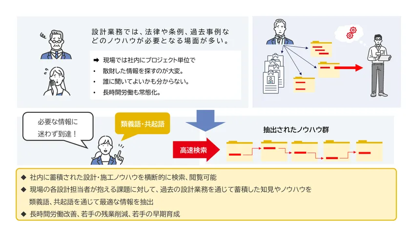 国土交通省が2019年に公表した「建設業界の現状とこれまでの取組」によると、業界の就業者数は1997年をピークに下降に転じ、慢性的な人手不足が続いています。こうした中、政府はIoTやビッグデータ、ロボットによる自動化などで建設現場の生産性向上を図る「i-Construction」を掲げ、業界のDXを後押ししています。一方、デスクワークに目を転じると、専門用語で設計・施工のノウハウが記載された数多くの文書が社内に散在し、必要な情報が容易に探せず、ナレッジ共有の障壁ともなっています。