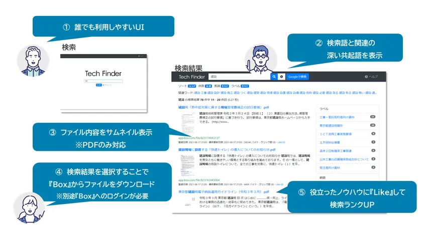 イントラマートCSI社が提供する「Tech Finder」は、部門やプロジェクト、年度などの単位で保存された文書に対し、約10,000語を収録する建設業界の用語辞書と共起語生成・形態素解析といった機能によって必要な情報を瞬時に検索することが可能です。また、単に検索ワードに合致した文書だけではなく、利用者の検索意図に沿って関連性が強い文書を自動でリコメンドするため、経験豊富なベテランの人材が持つ知見やノウハウなど社内に蓄積した有用なナレッジの横断的な共有を実現します。それにより、長時間労働の改善、若手の残業削減、早期育成に貢献します。将来的にはワークフローを用いて、承認された文書だけがBoxに保存されるといった機能等も視野に入れています。
